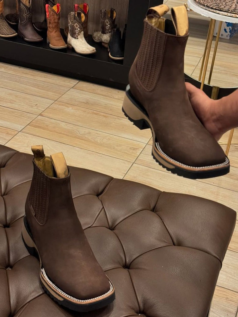 Blending Western-inspired ruggedness with classic Chelsea boot convenience, these brown nubuck boots feature a durable, water-resistant upper and a square-toe silhouette for bold style. The elastic side panels ensure a snug, slip-on fit, while the chunky non-slip rubber outsole delivers reliable traction on both urban streets and rural terrain. Designed for both work and casual wear, they pair seamlessly with jeans or work pants, combining timeless comfort with tough, all-day performance.